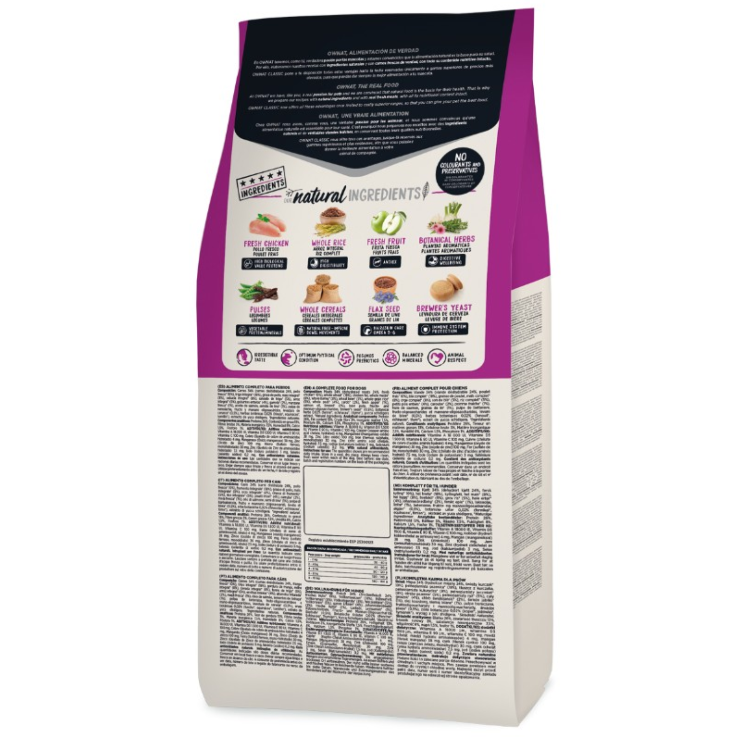 Carnes 34% (carnes deshidratadas 24%, pollo fresco* 10% antes de la extrusión), trigo integral* (18%), grasa de pollo, maíz integral* (8%), cebada integral* (8%), salvado de trigo* (5%), arroz integral* (5%), guisantes enteros* (4%), algarroba* (2%), manzana* (1%), aceite de salmón, semilla de lino* (1%), pulpa de remolacha, fructo y manano oligosacáridos, levadura de cerveza* (0,5%), plantas aromáticas 0,02% (hinojo*, equinácea*, tomillo*), yucca schidigera. *Ingredientes naturales