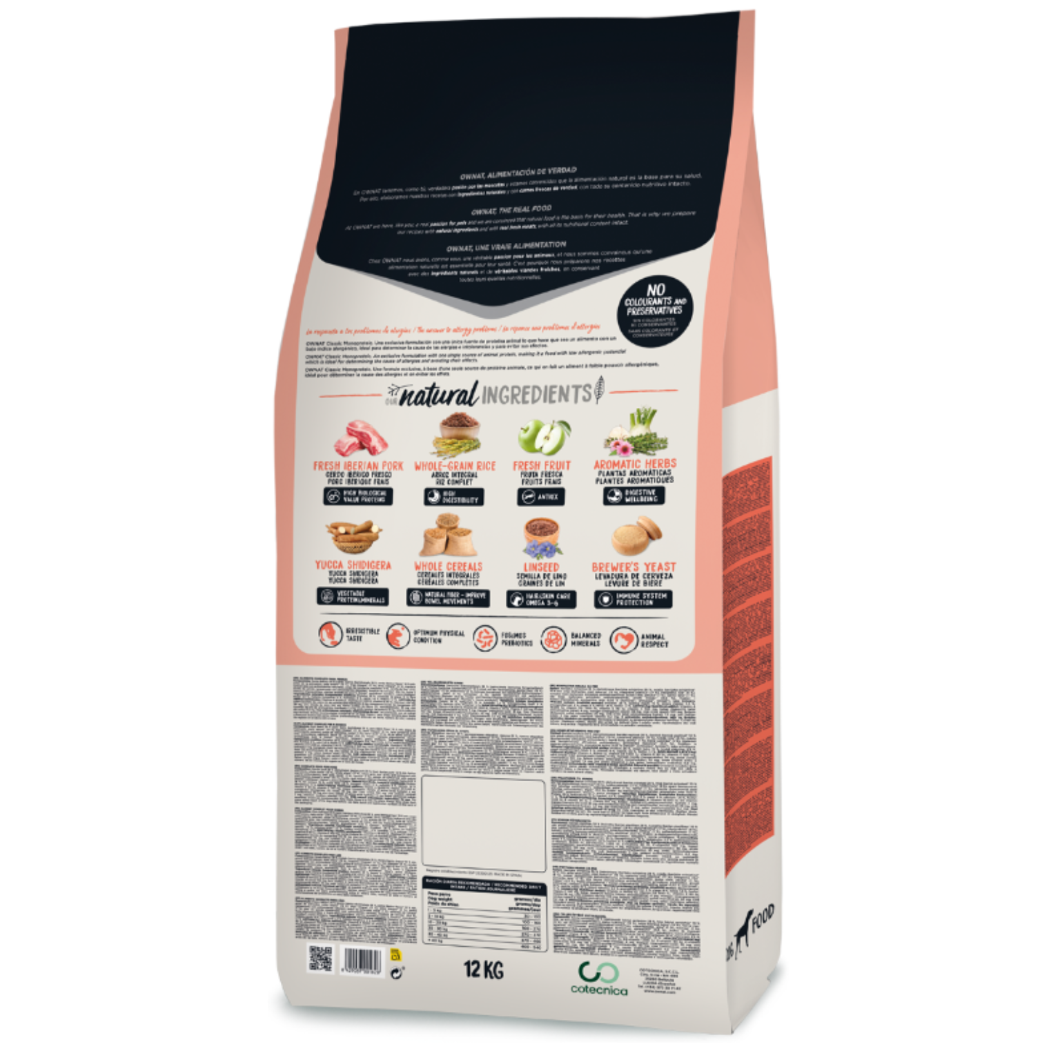 Cerdo ibérico 38 % (cerdo ibérico deshidratado 28 %, cerdo ibérico fresco* 10 % mín. antes de la extrusión), maíz entero* (19 %), trigo integral* (17 %), arroz integral* (8 %), manteca (preservada con antioxidantes naturales), pulpa de remolacha, manzana* (1 %), semilla de lino* (1 %), aceite de salmón (preservado con antioxidantes naturales), levadura de cerveza* (0,5 %), fructo y manano oligosacáridos, plantas aromáticas 0,02 % (hinojo*, equinácea*, tomillo*), yucca shidigera. *Ingredientes naturales