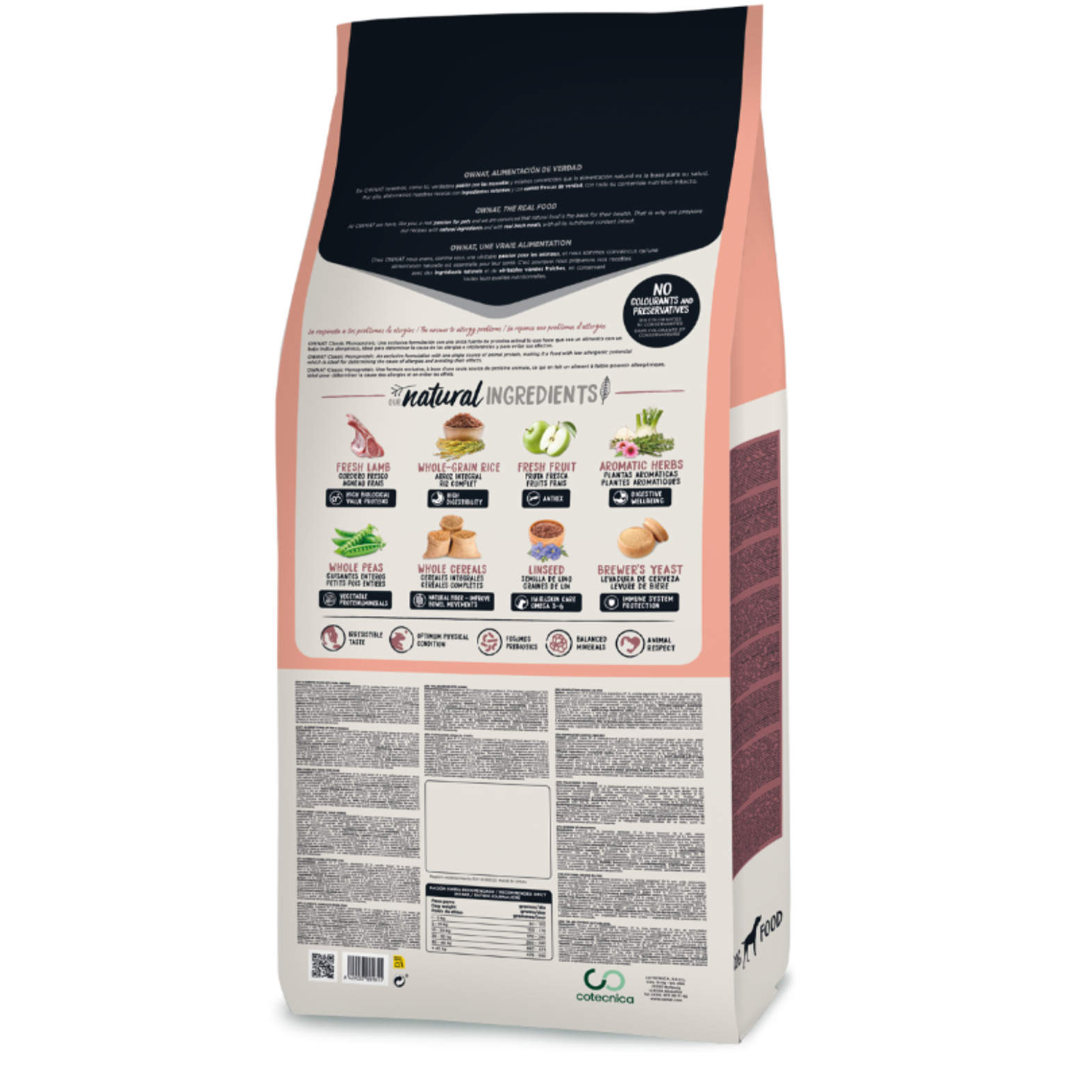 Cordero 37 % (cordero deshidratado 27 %, cordero fresco* 10 % mín. antes de la extrusión), trigo integral* (18 %), maíz entero* (13 %), arroz integral* (8 %), guisantes enteros* (8 %), grasa avícola (preservada con antioxidantes naturales), pulpa de remolacha, manzana* (1 %), semilla de lino* (1 %), aceite de salmón (preservado con antioxidantes naturales), levadura de cerveza* (0,5 %), fructo y manano oligosacáridos, plantas aromáticas 0,02 % (hinojo*, equinácea*, tomillo*), yucca shidigera. *Ingredientes naturales