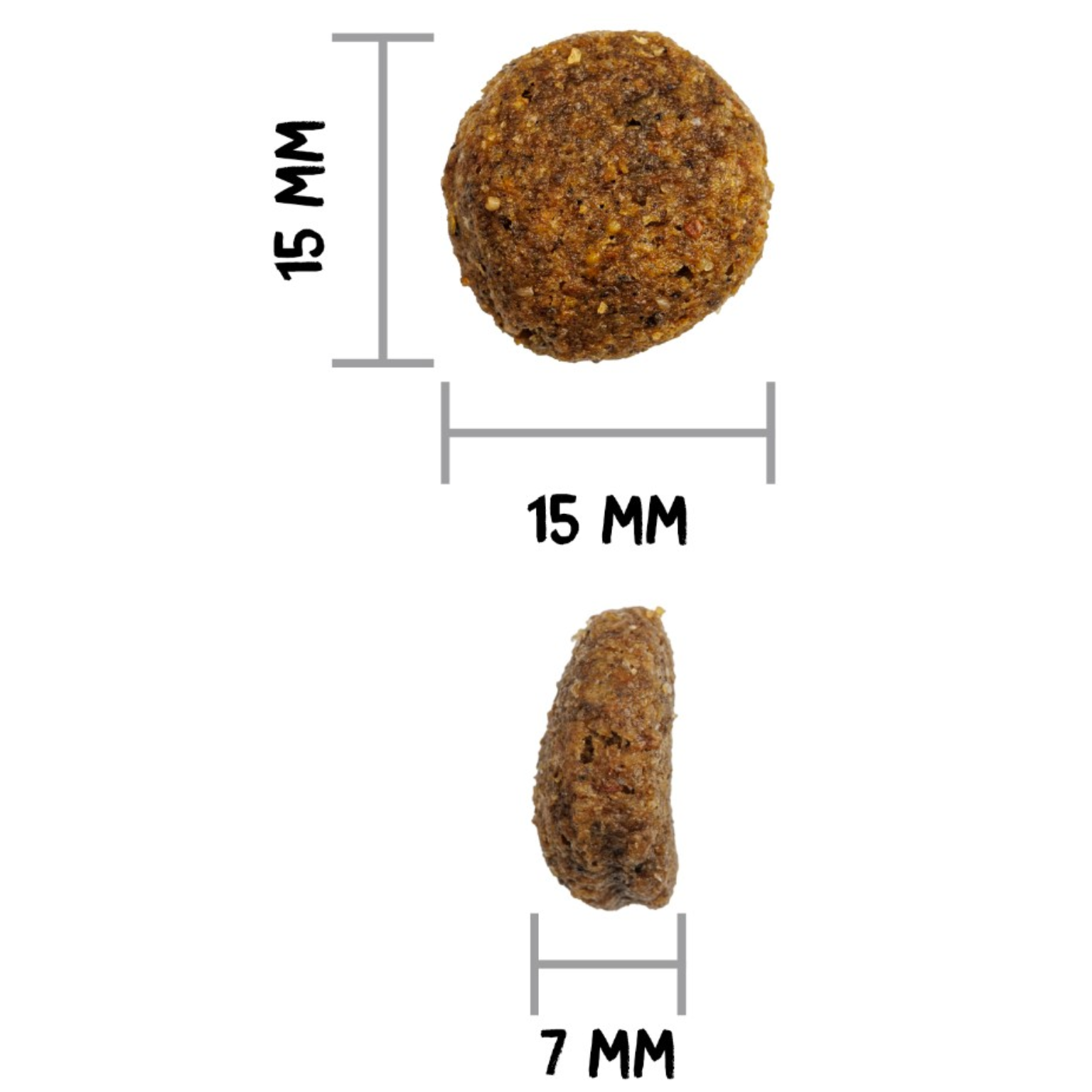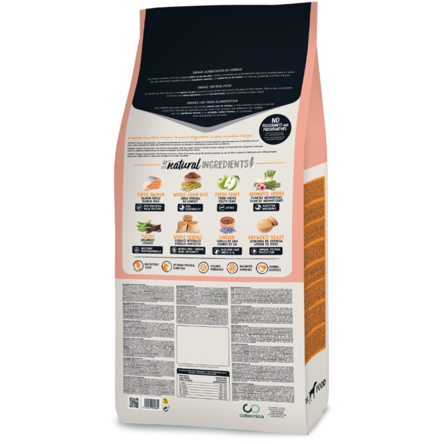 Salmón 30 % (salmón deshidratado 20 %, salmón fresco* 10 % mín. antes de la extrusión), guisantes enteros* (16 %), trigo integral* (15 %), maíz entero* (12 %), arroz integral* (8 %), grasa avícola (preservada con antioxidantes naturales), pulpa de remolacha, vaina de algarroba* (2 %), manzana* (1 %), semilla de lino* (1 %), aceite de salmón (preservado con antioxidantes naturales), levadura de cerveza* (0,5 %), fructo y manano oligosacáridos, plantas aromáticas 0,02 % (hinojo*, equinácea*, tomillo*), yucca shidigera. *Ingredientes naturales