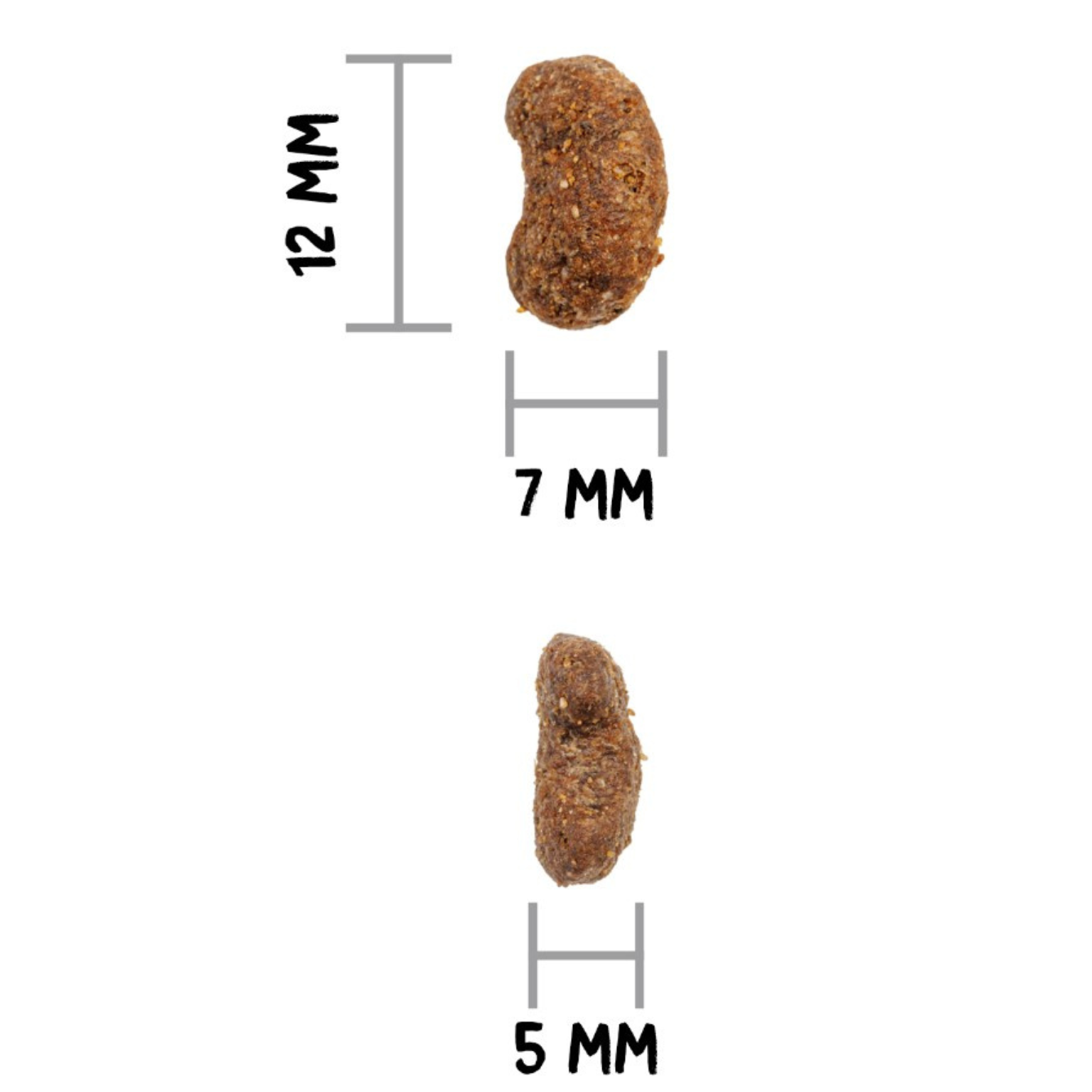 Proteína: 33 %, contenido de grasa: 14 %, fibra bruta: 3,5 %, materia inorgánica: 7 %, humedad: 8 %, omega 6: 1,6 %, omega 3: 0,7 %, calcio: 0,8 %, fósforo: 0,8 %, sodio: 0,7 %, magnesio: 0,09 %.